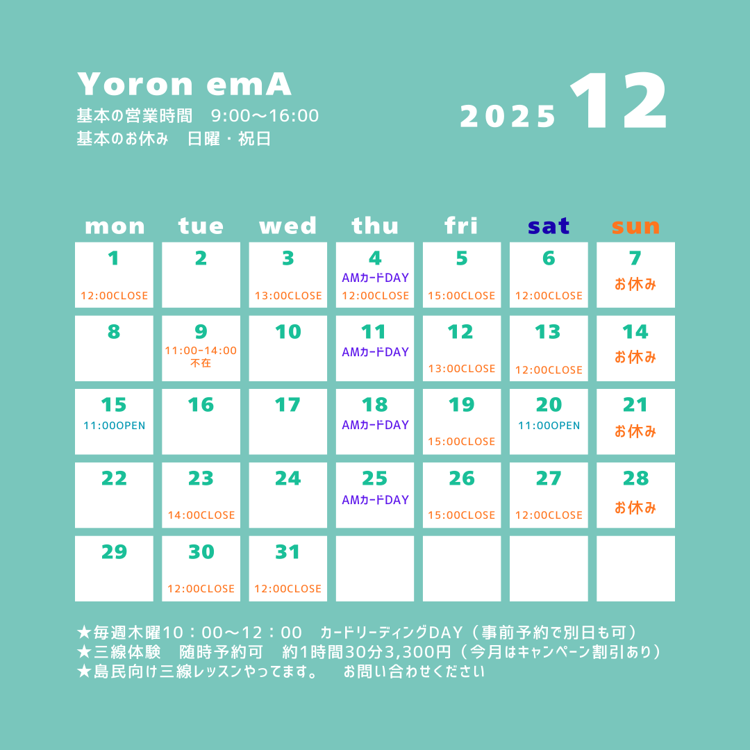 YoronRetreatを運営するYoron emA(ヨロン・エマ)のショップ。与論をテーマにしたモノづくりをしている方々の作品を多数取り扱っています。ヨロンリトリートの体験メニュー「三線遊び」や「カードリーディング」もここで行っています。