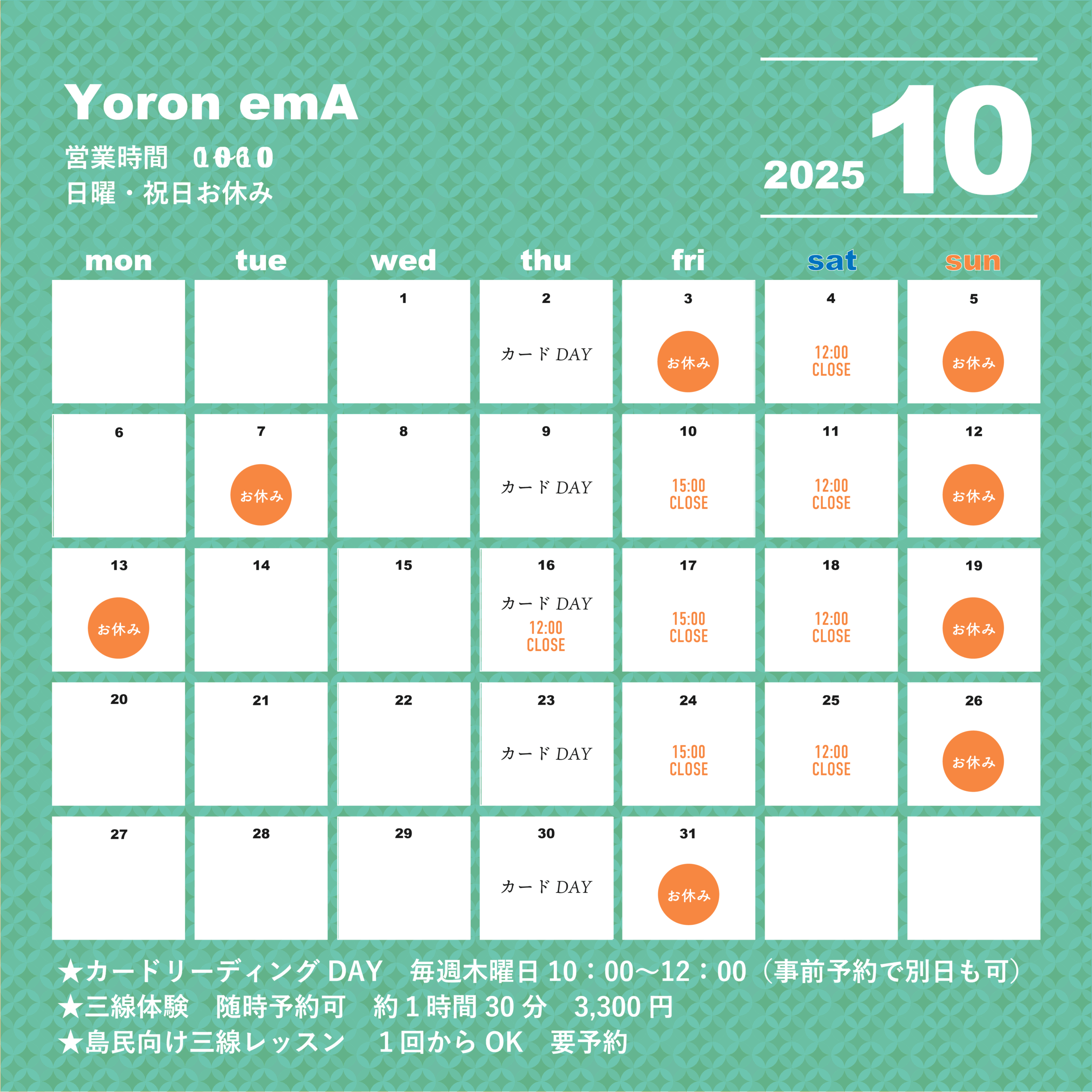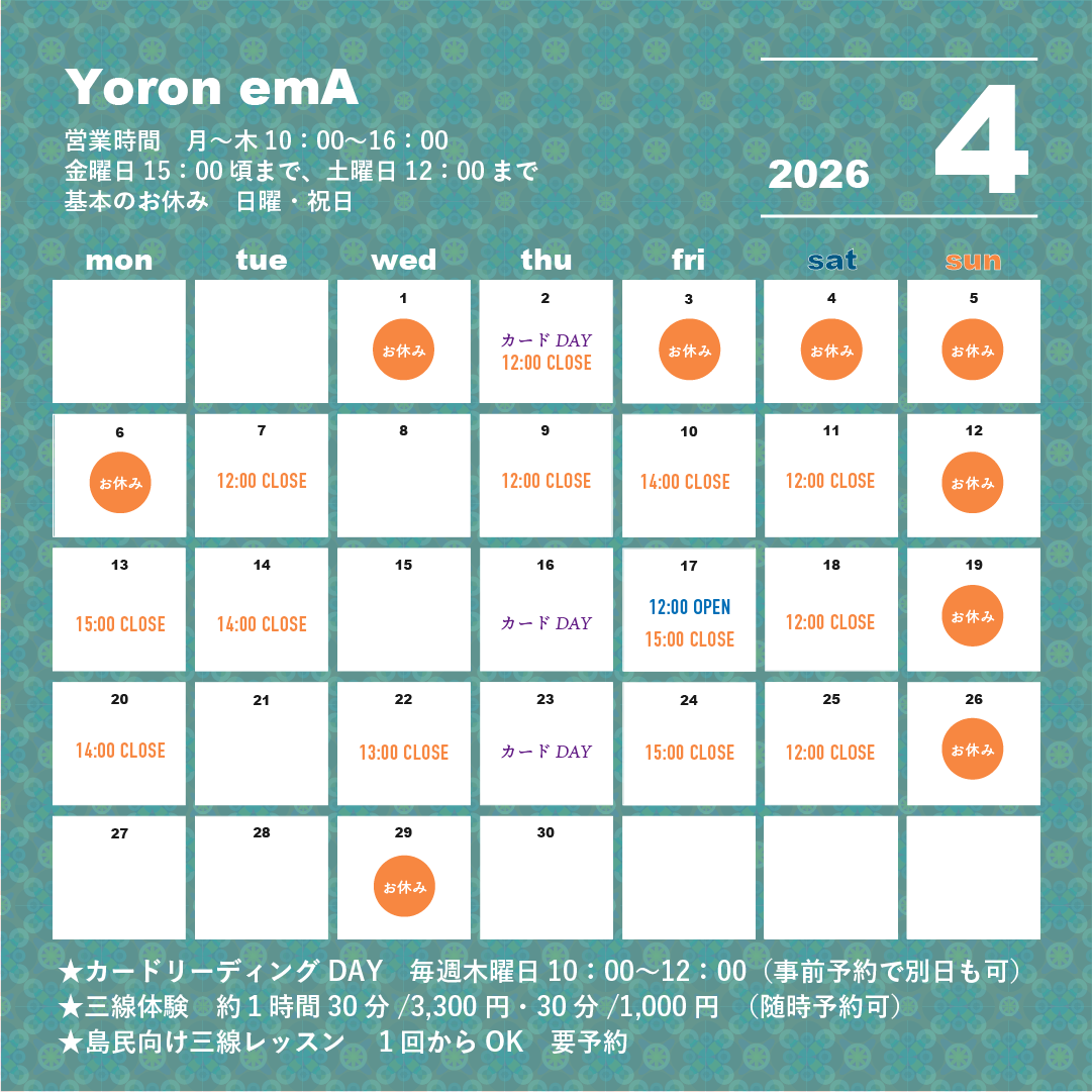 YoronRetreatを運営するYoron emA(ヨロン・エマ)のショップ。与論をテーマにしたモノづくりをしている方々の作品を多数取り扱っています。ヨロンリトリートの体験メニュー「三線遊び」や「カードリーディング」もここで行っています。